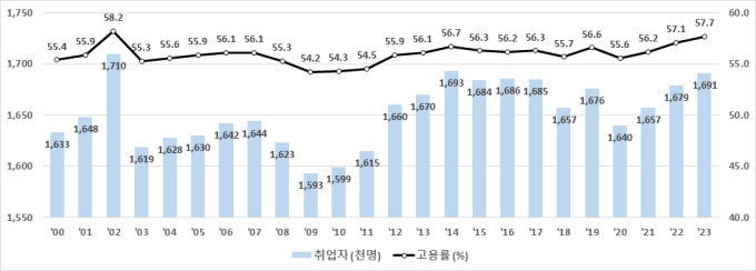 2023년 연간 고용률은 57.7%로 통계작성이 시작됐던 2000년 55.4%보다 2.3%p 상승해 2002년 이후 최고 수치를 기록했고, 실업률은 3.1%로 통계작성이 시작됐던 2000년 7.1%보다 4%p 하락해 역대 최저인 2022년 3.0% 다음으로 적은 수치를 나타냈다.