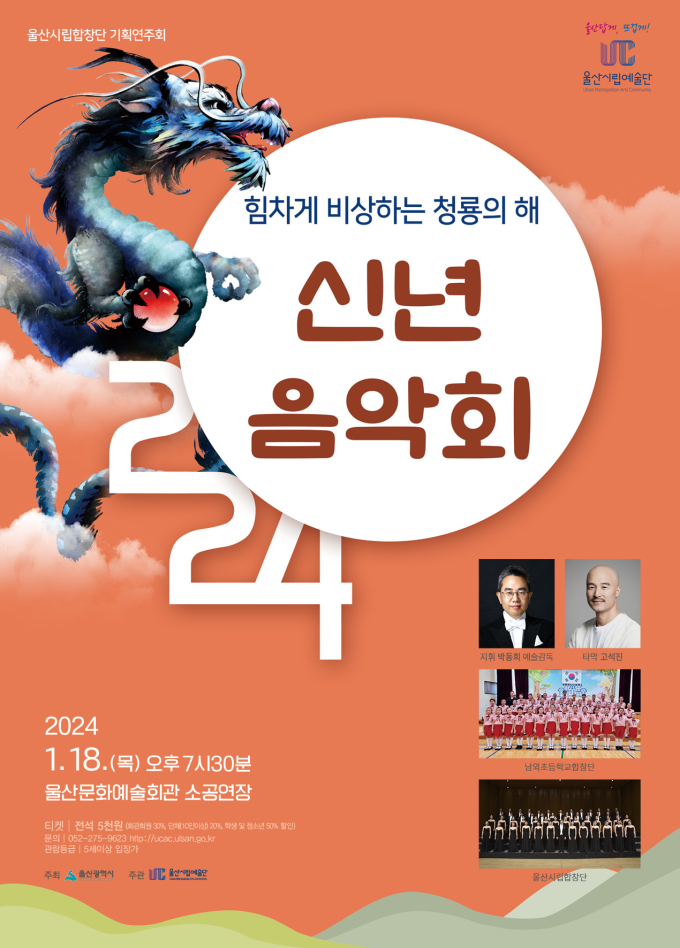 울산시립합창단이 2024년 힘차게 비상하는 청룡의 해를 맞이하여 18일 오후 7시 30분 울산문화예술회관 소공연장에서 신년 음악회를 선보인다.