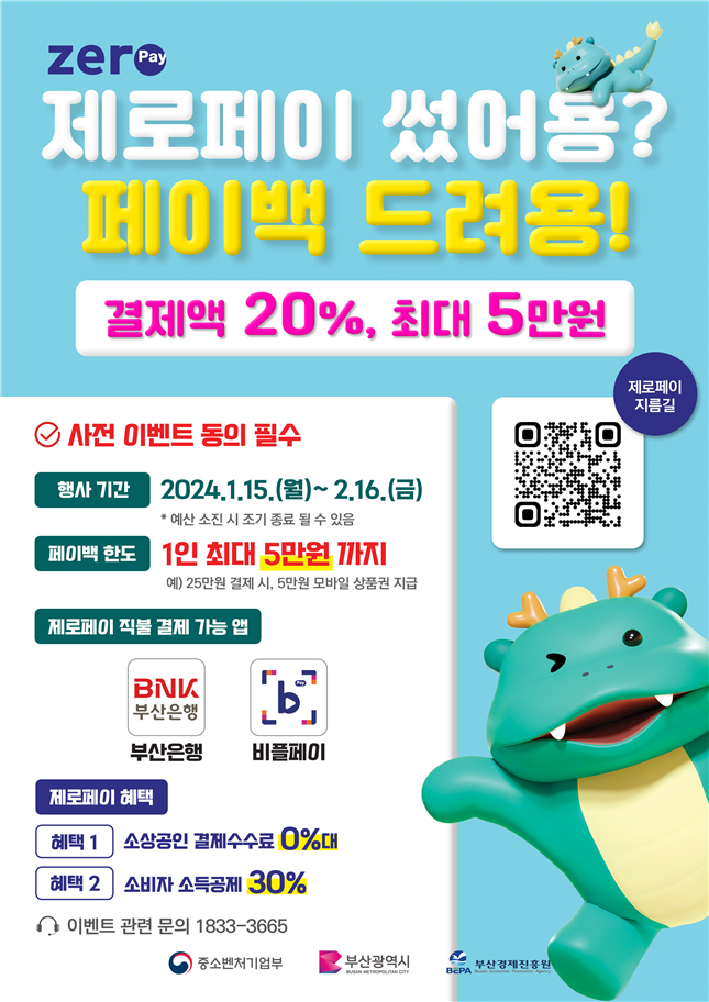 부산시는 설 명절을 앞두고 오늘 15일부터 내달 16일까지 「설 맞이 제로페이 20% 페이백 행사」를 실시한다고 밝혔다.
