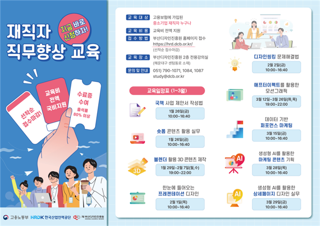재직자 직무향상 교육 포스터.부산디자인진흥원 이번 교육은 ‘지역·산업 맞춤형 인력양성사업’의 일환으로 직무 능력 향상을 위해 마련된 것으로 고용보험에 가입된 중소기업 재직자 누구나 참여 가능하다.