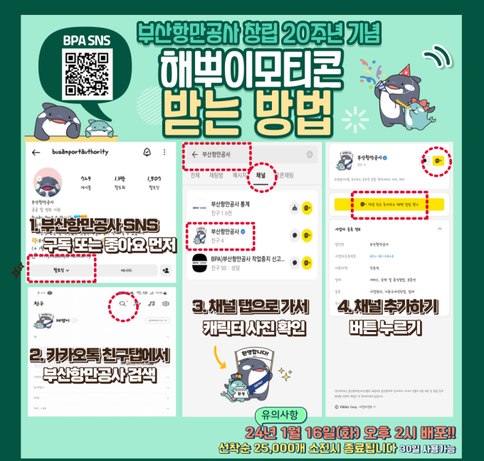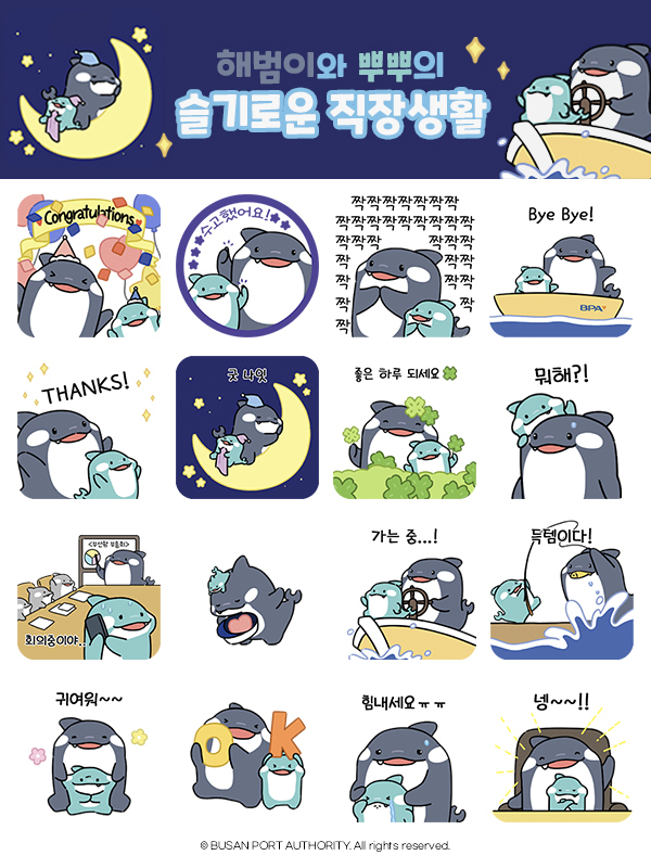 부산항만공사는 창립 20주년을 기념해 ‘해범이와 뿌뿌의 슬기로운 직장생활’을 콘셉트로 한정판 카카오톡 이모티콘을 제작해 16일 오후 2시부터 선착순 2만 5천 명에게 배포한다.‘해범이와 뿌뿌의 슬기로운 직장생활’이모티콘은 카카오톡에서 ‘부산항만공사’채널을 신규 추가하면 내려받을 수 있으며, 30일 동안 무료로 사용할 수 있다.