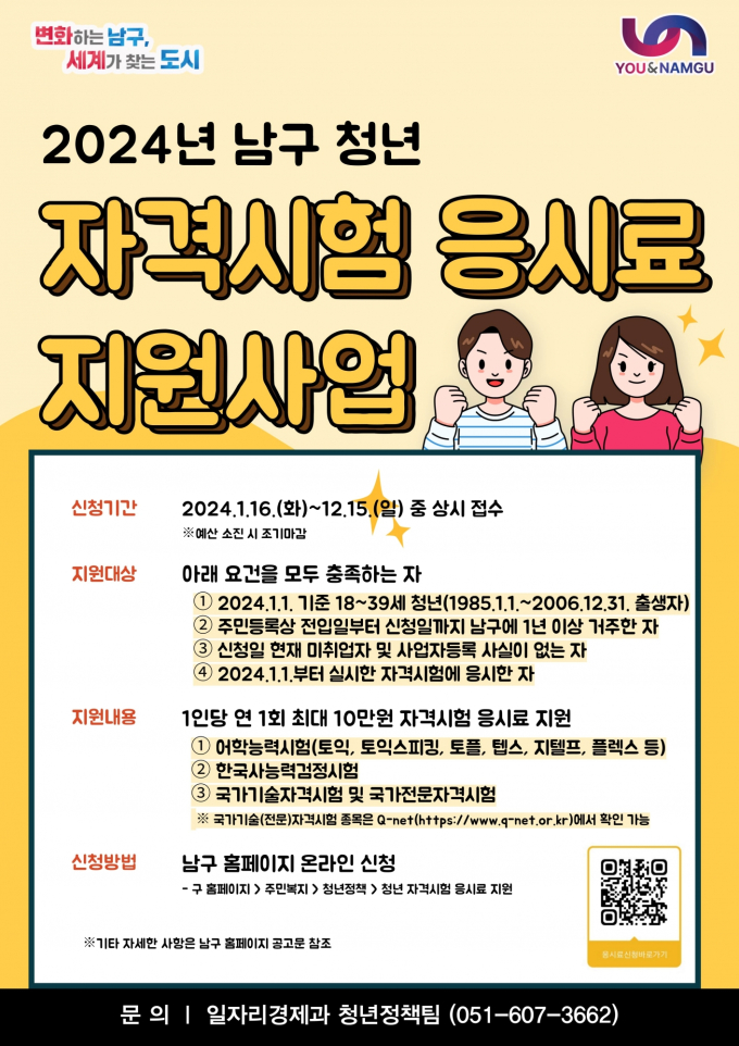부산 남구는 청년 구직활동에 대한 경제적 부담을 완화하기 위해 '2024 청년 자격증 응시료 지원사업'을 시행한다.