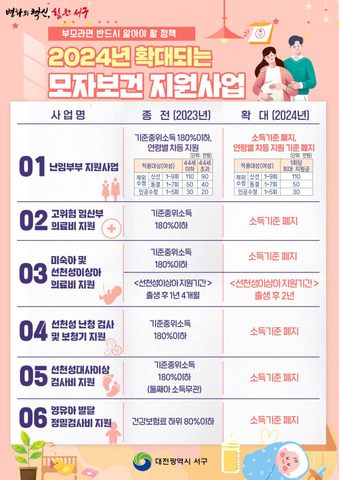 대전 서구는 올해부터 난임부부 지원사업을 확대하고 임산부와 영유아 관련 의료비 지원 대상 소득 기준을 폐지한다고 22일 밝혔다.