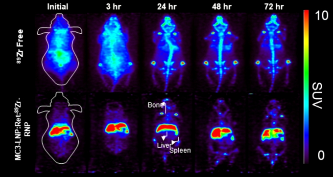 지르코늄89와 합성한 크리스퍼 단백질을 간경화 질환을 가진 실험용 쥐에 투여하고 72시간을 추적한 PET 영상자료, 상단은 정맥주사 한 경우 전체적으로 분포한 모습, 하단은 지질 나노입자로 둘러싼 89Zr-LbCas12a 단백질이 간부위에 분포된 모습. 한국원자력연구원 Cas12a는 일반적으로 사용하는 유전자가위인 Cas9 대비 사이즈가 작고 유전자 편집기능이 더 정교한 특성을 갖는다.