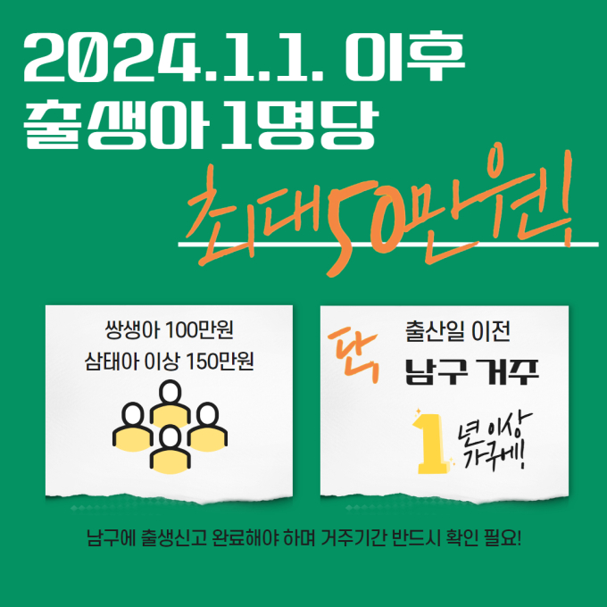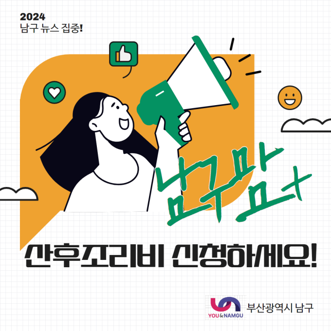 부산 남구는 지역의 출산율을 높이고 아이도 부모도 살기 좋은 도시를 만들기 위해 2024년부터 출산가구 대상 산후조리비를 지원하는 「남구맘+ 산후조리비 지원사업」을 신규 추진한다.