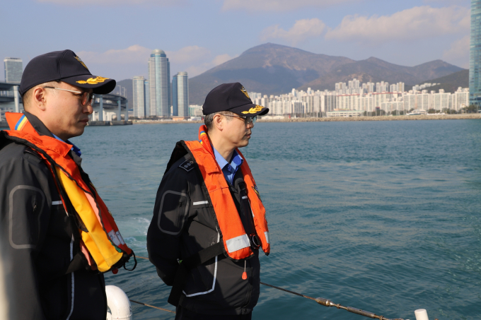 김형민 부산해양경찰서장이 소형경비정에 탑승해 부산 연안해역을 점검하고 있다.부산해경