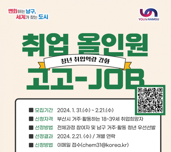 부산 남구는 청년들의 취업 준비를 지원하고, 미래에 더 나은 일자리를 찾을 수 있도록 ‘취업 올인원 고고-JOB’ 프로그램을 추진한다.