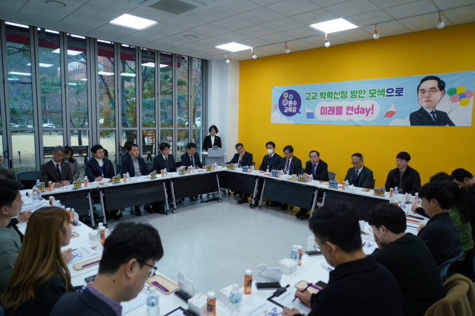 고교 학력신장 방안 회의.부산교육청 부산광역시교육청은 20일 오후, 시교육청 별관 소통공감실에서 일반고 교장 10명, 고3 부장 교사 10명, 학부모 10명, 고3 학생 10명 등이 참석한 가운데 ‘교육감 만난 Day! - 고교 학력 신장 방안 모색으로 미래를 연Day!’ 행사를 개최했다.