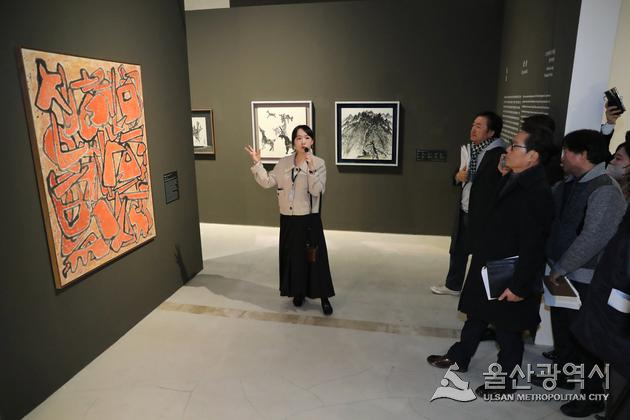 작품을 설명하고 있는 전시 해설사 자료사진.울산시
