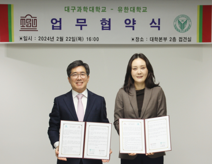 대구과학대학교는 22일 대학본부 접견실에서 유한대학교와 공유·협업 활성화 및 지역산업 발전과 전문인재 양성을 위한 업무협약을 체결했다.