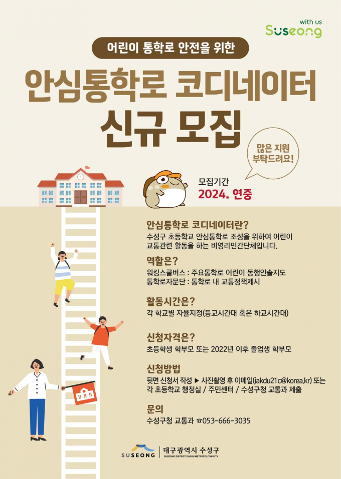 지역 초등학생 학부모와 초등학교 졸업생 학부모를 코디네이터로 모집하며, 신청 방법 등 자세한 사항을 알고 싶다면 수성구청 교통과로 문의하면 된다.