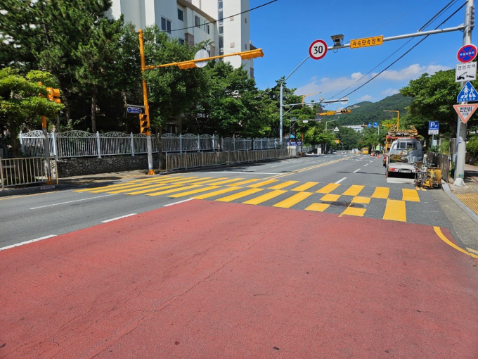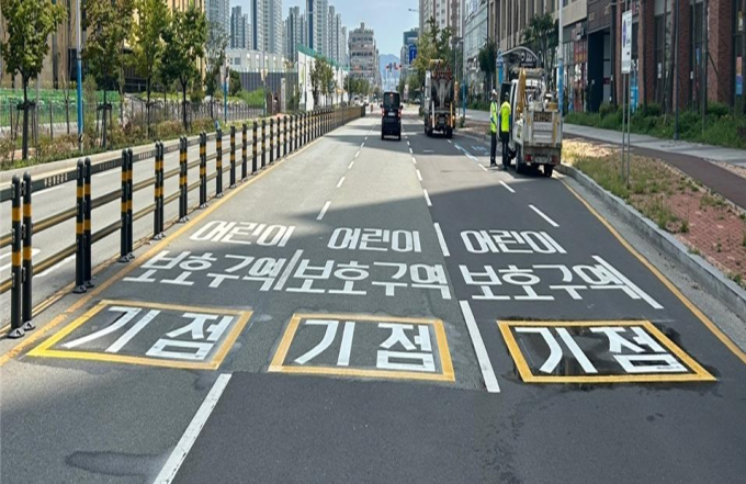 부산 해운대구 양운초등학교 앞 노란색 횡단보도.부산경찰청 먼저 지난 2월 21일부터 부산시내 어린이 보호구역 846개소를 대상으로 노후·훼손된 시설물 관리상태 점검, 시인성 향상을 위한 노란색 횡단보도, 기·종점 노면표시 등을 설치 또는 보수하는 등 안전한 등굣길 보행환경 조성을 위해 교통안전시설물에 대한 일제 정비를 시행하고 있다.