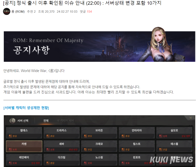 레드랩게임즈가 개발하고 카카오게임즈와 함게 공동 서비스하는 신작 MMORPG ‘롬’이 27일 오전 10시 글로벌 정식 출시됐다. 하지만 시작부터 각종 이슈가 터져나오면서, 출시 12시간 만인 같은 날 오후 10시 공식 카페를 통해 확인된 이슈 10개를 설명하는 등 문제 대응에 고심하고 있다.