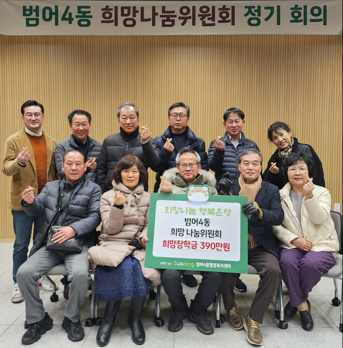 대구 수성구 범어4동 희망나눔위원회는 지난달 27일 지역 저소득 청소년을 위한 ‘희망장학금’ 390만원을 범어4동 행정복지센터에 기탁했다.
