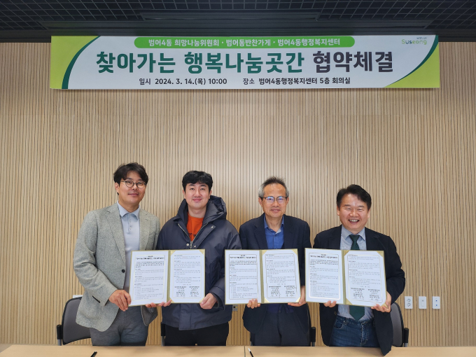 대구 수성구 범어4동은 지난 14일 밑반찬 나눔 사업 추진을 위해 범어4동 희망나눔위원회, 범어동반찬가게와 ‘찾아가는 행복나눔곳간’ 협약을 체결했다.