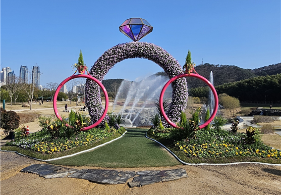 특히 올해는 지난해보다 더 넓은 면적을 확보해 무지개 분수를 배경으로 다양한 봄꽃과 관엽식물을 식재하고 꽃반지 조형물을 설치했다.