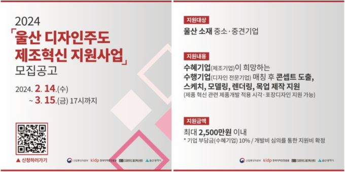 울산시가 울산 디자인주도 제조혁신센터와 공동으로 오는 5월 9일까지 ‘2024 중소기업 디자인 개발 지원사업'에 참여할 기업을 모집한다.