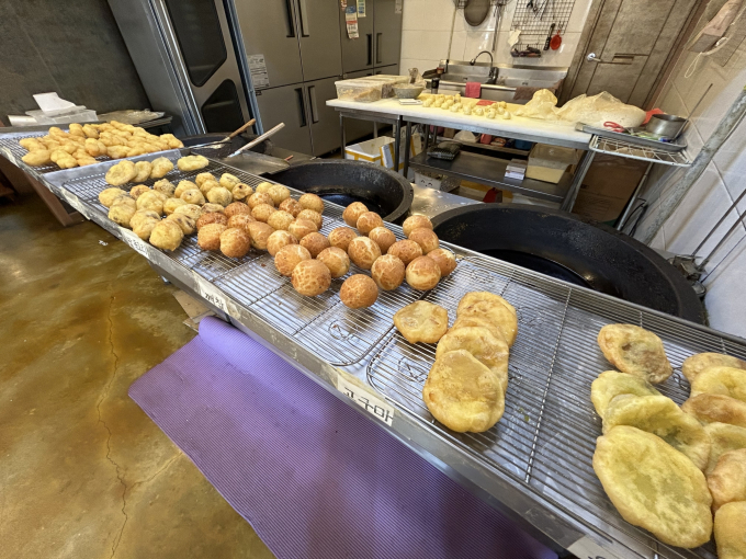 가마솥에 식용유를 한가득 넣고 갓 튀겨낸 도넛들이 손님을 기다리고 있다.