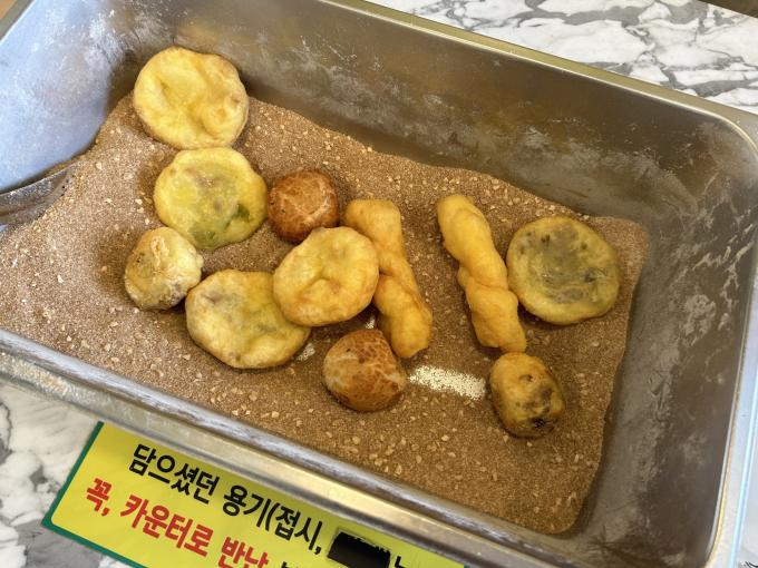 고구마 앙금, 녹두 앙금, 팥앙금 등 손님의 입맛을 몰라 다 준비한 도넛들을 내 입맛에 맞춰 담았다.