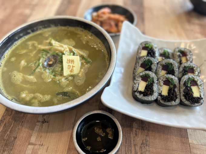 배말 칼국수와 톳김밥. 방금 도넛을 먹었는데도 입맛을 자극한다.윤채라 기자