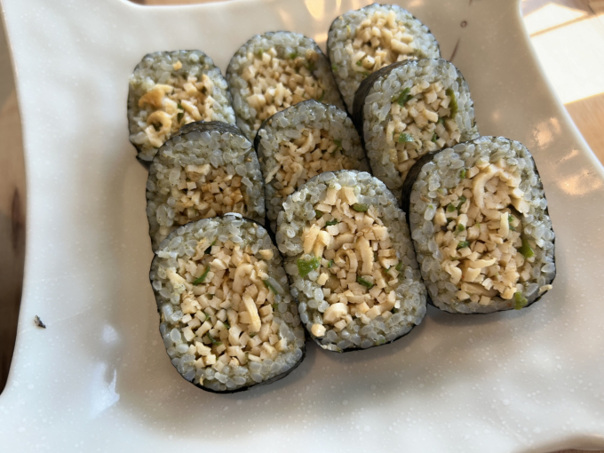 톳김밥 한 줄로는 부족해 추가 주문한 어묵땡초 김밥. 매콤한 땡초와 부드러운 어묵과 밥의 조화가 매력이다.윤채라 기자
