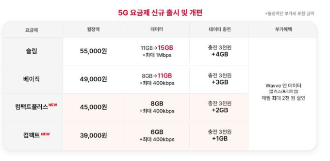 기존 중저가 요금제의 데이터 제공량도 늘어난다. 기존 가장 저렴했던 ‘베이직(월 4만9000원)’ 요금제의 데이터 제공량을 8GB에서 11GB로 늘린다. ‘슬림(월 5만5000원)’ 요금제의 제공량은 11GB에서 15GB로 늘어난다. 늘어나는 데이터는 다음 달 1일부터 별도의 신청 없이 자동으로 적용된다.