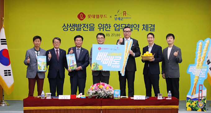 롯데웰푸드는 27일 남해군과 상생발전을 위한 ‘우리농산물 상생 프로젝트’ 업무협약을 체결하고 특산물을 활용한 ‘남해 유자 빼빼로’를 선보인다고 28일 밝혔다.