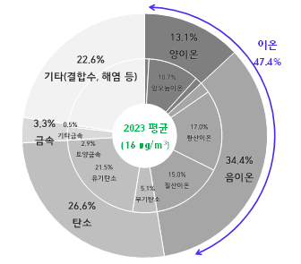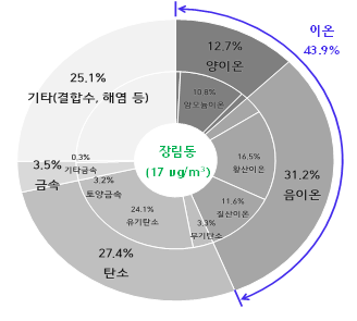 조사에 따르며 초미세먼지 성분분석 조사 결과 ▲유기탄소(21.5퍼센트(%)) ▲황산이온(17.0퍼센트(%)) ▲질산이온(15.0퍼센트(%)) ▲암모늄이온(10.7퍼센트(%)) 등이 주성분으로 나타났다.