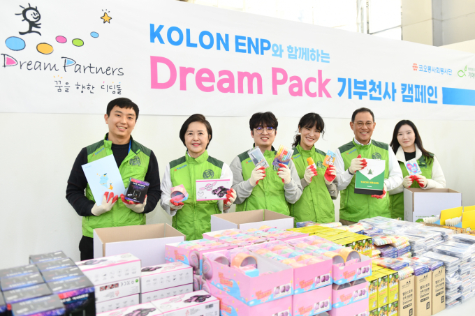 코오롱사회봉사단은 2일 경기 과천 코오롱타워에서 허성 코오롱ENP 대표이사를 비롯함 임직원 60명이 참여한 가운데 드림팩 제작 봉사활동에 나섰다. 학용품과 놀이용품, 간식 등으로 구성된 드림팩 870개를 포장해, 파트너 기관인 기아대책과 함께 사업장 인근 지역아동센터 30곳에 직접 배송하거나 택배발송했다.