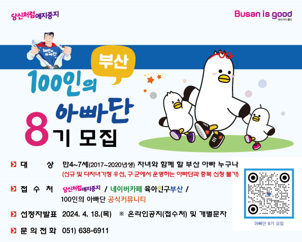 이에 따라 부산시는 아빠들의 적극적인 육아 참여와 부부가 함께 육아하는 사회 분위기 조성을 위해 오는 14일까지 「부산 100인의 아빠단(8기)」을 모집한다.