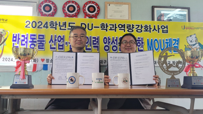 대구대학교 반려동물산업학과가 K1탐지견센터와 2일 K1탐지견센터 사무실에서 반려동물 산업 및 전문 인력 양성을 위한 상호 업무협약을 체결했다.