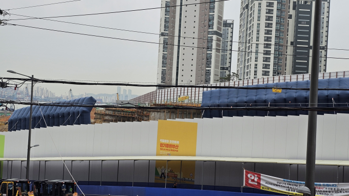 돌덩이가 날아온 아파트 공사 현장.윤채라 기자 제보자 등에 따르면 사고당시 경비실 내부에 경비원이 있었고, 경비실 옆을 지나던 주민이 다수 있었다.