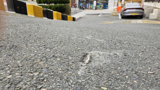 날아온 돌덩이에 아스팔트 바닥이 패였다.윤채라 기자