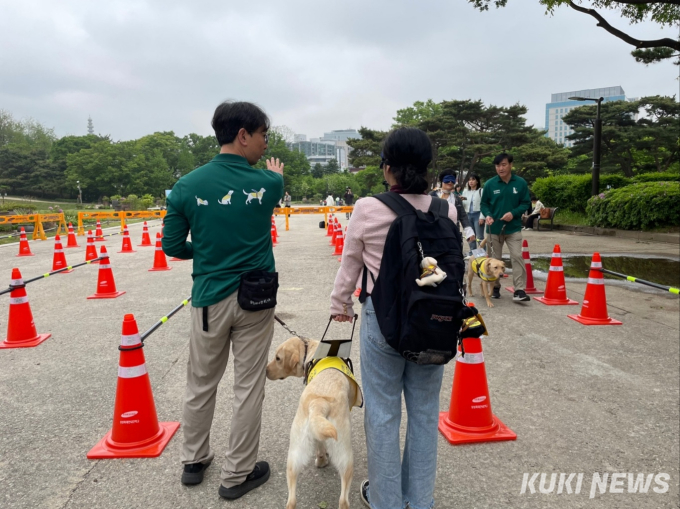 비장애인 참석자들은 직접 눈을 가리고 보행 체험을 하면서 장애인에 대한 편견을 없앴다. 하네스를 손에 쥐고 “가자”고 말하자 안내견은 천천히 앞으로 나아갔다. 정해진 코스를 함께 천천히 걸었다. 잔뜩 긴장해서인지 실제보다 훨씬 빠른 속도처럼 느껴졌다. ‘오른쪽으로 돌다가 안내견 꼬리를 밟으면 어떡하지’ ‘똑바로 걷고 있는 건 맞는지’ 방향감을 상실한 채 오만 생각으로 머리가 가득 찼다.
