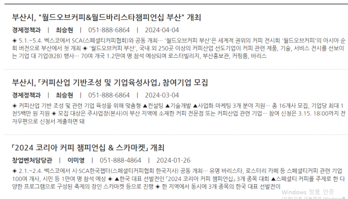 부산시청 홈페이지에서 '커피'를 검색하면 놀라운 화면을 볼 수 있다. 커피 관련 행사가 봇물을 이루고 있다