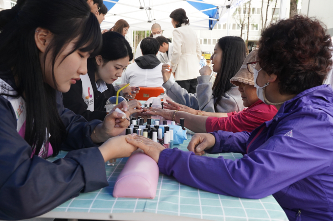 수성대는 이날 대구 수성구 황금복지관에서 피부건강관리과 학생들이 경로잔치에 참석한 어르신들을 위해 ‘네일아트/손마사지/립메이크업’ 서비스를 제공했다.