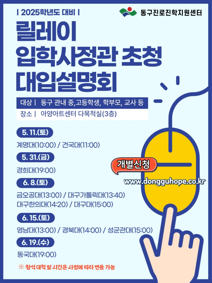 대구 동구청은 학생과 학부모에게 실질적인 대입 정보를 제공하기 위해 11일부터 6월 19일까지 동구 아양아트센터 다목적실에서 ‘2025학년도 대입 릴레이 입시설명회’를 개최한다.