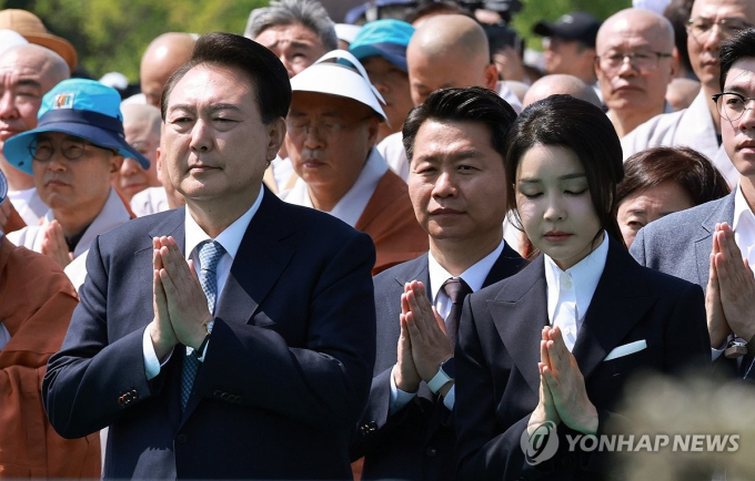 윤 대통령과 김 여사는 19일 경기 양주 회암사지에서 열린 ‘회암사 사리 이운 기념 문화축제 및 삼대화상 다례제’에 나란히 참석했다. 이날 행사는 지난달 16일 미국 보스턴미술관으로부터 섭불, 정광불, 석가불, 나옹선사, 지공선사(3여래 2조사)의 사리가 100년 만에 본래 자리로 돌아온 것을 기념해 열렸다.