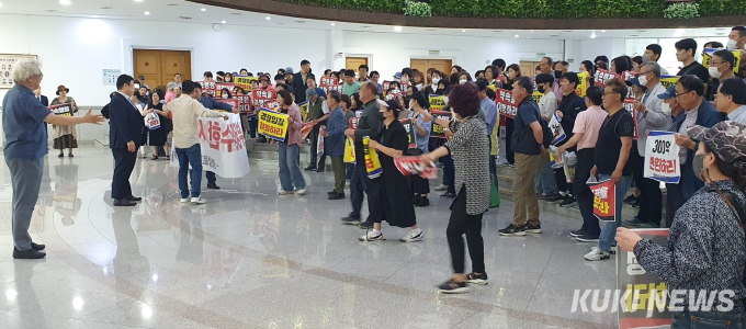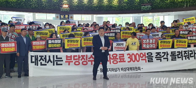 대전 중앙로지하상가 비상대책위원회 상인과 회원 등 200여 명은 20일 오후 2시 대전시의회 로비에서 집회를 열고 "대전시는 경쟁입찰을 멈추고 30년간 부당징수한 임대료 300억 원을 반환하라"고 촉구했다.
