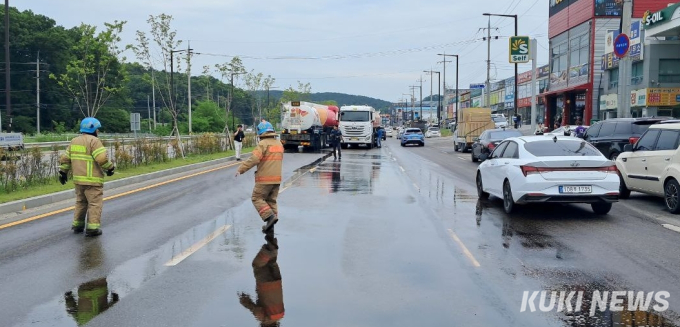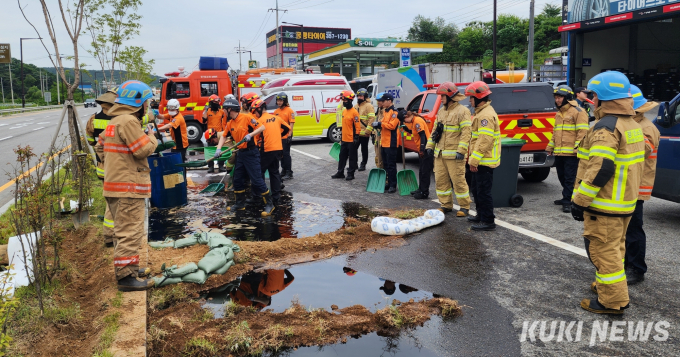 사고 발생 직후 구조 요청을 접수한 화성소방서 측은 현장도착 후 곧장 화성시청 등 관계 기관에 화학물질 유출상황을 보고했으며 동시에 남양119안전센터는 흡착포를 통해 1차 방제작업을 진행했다.