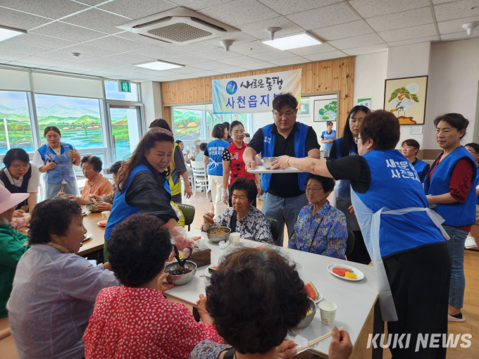 새로운 동행 사천읍지회(회장 김승우)가 18일 사천읍 사남면에 위치한 사랑원노인지원센터를 찾아 지역 어르신들을 위한 '짜장면 나눔봉사'를 펼쳤다.
