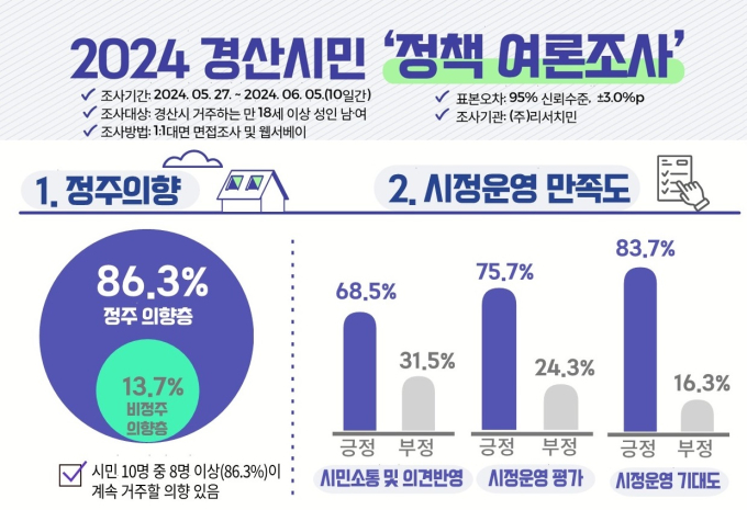 경산시는 민선 8기 2주년 반환점을 맞아 시정 활동 전반에 대한 시민들의 인지도·만족도 파악을 위해 ‘2024 경산시민 정책 여론조사’를 했다고 26일 밝혔다.