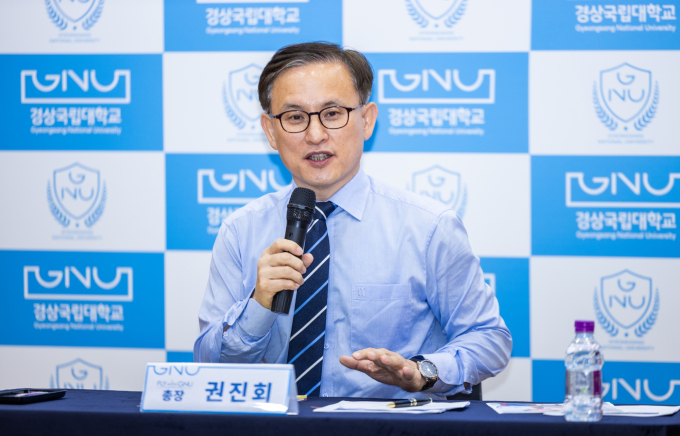 권 총장은 대학 발전 비전을 'Fly with GNU, 혁신을 이끄는 국가거점국립대학의 리더'로 정하고, 목표는 '혁신하는 대학, 성장하는 대학, 행복한 대학으로 거점국립대 Top. 3 진입'이라고 밝혔다.