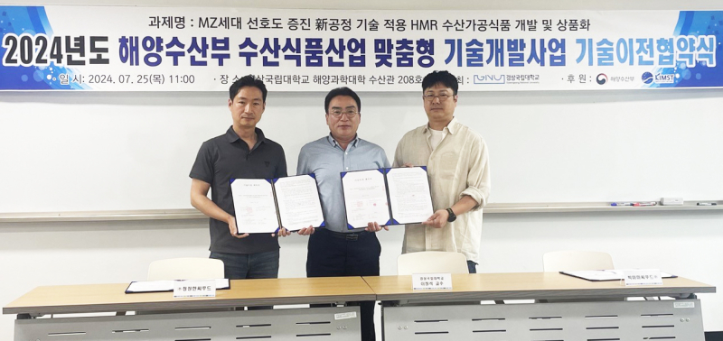 경상국립대(GNU·총장 권진회) 산학협력단(단장 최병근)은 25일 해양수산부 수산식품 현장맞춤형 기술개발사업(연구책임자 이정석 해양식품공학과 교수)의 2차 연도 연구결과를 빅마마씨푸드(대표 정원주)와 청정한씨푸드(대표 이영주)에 기술이전했다.