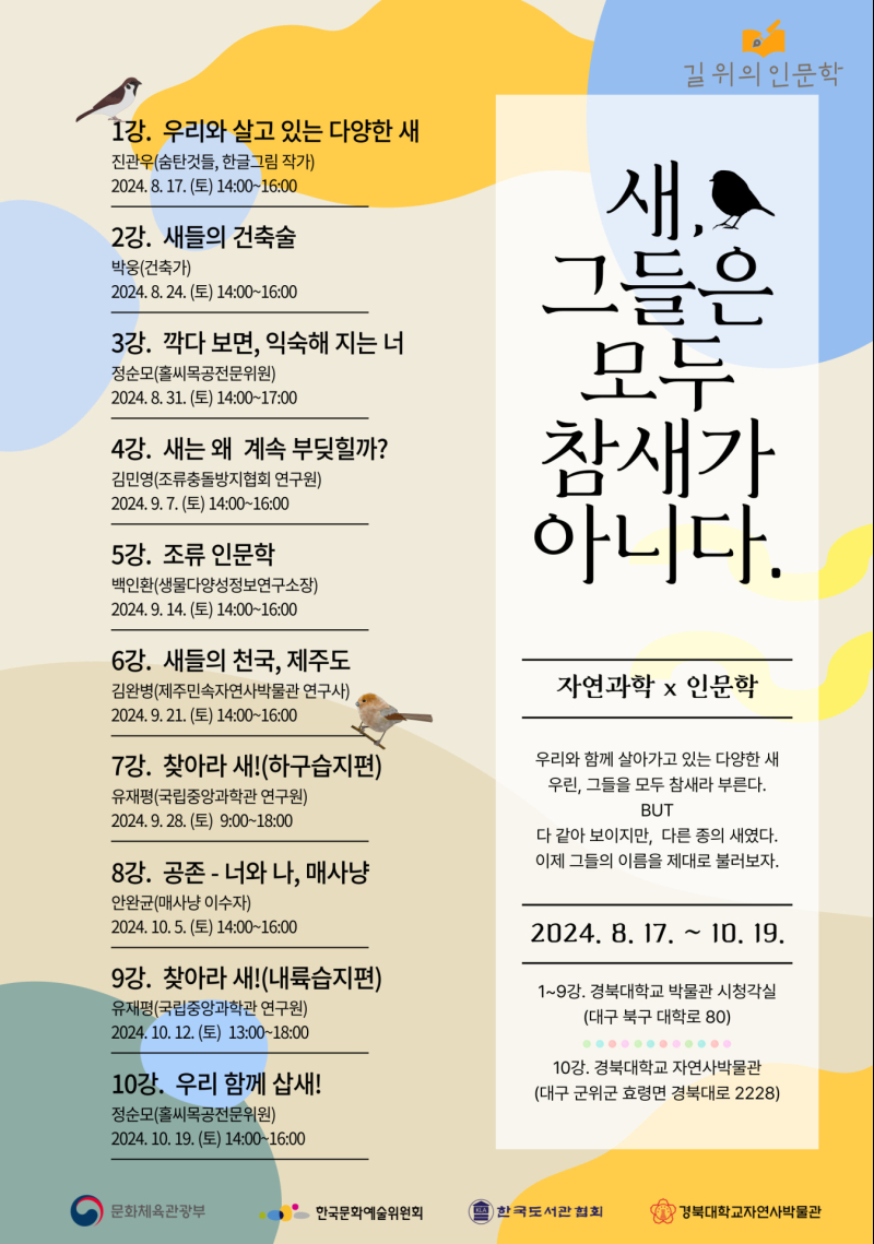경북대 자연사박물관은 오는 17일부터 10월 19일까지 매주 토요일 총 10회에 걸쳐 자연과학과 인문학이 융합된 ‘새, 그들은 모두 참새가 아니다’ 특강을 운영한다.