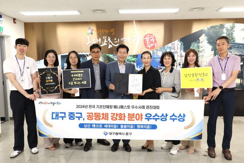 대구 중구청은 ㈔한국매니페스토실천본부와 경남연구원이 공동 주최한 ‘2024 전국 기초자치단체장 매니페스토 우수사례 경진대회’에서 공동체 강화 분야 우수상을 수상했다고 5일 밝혔다.