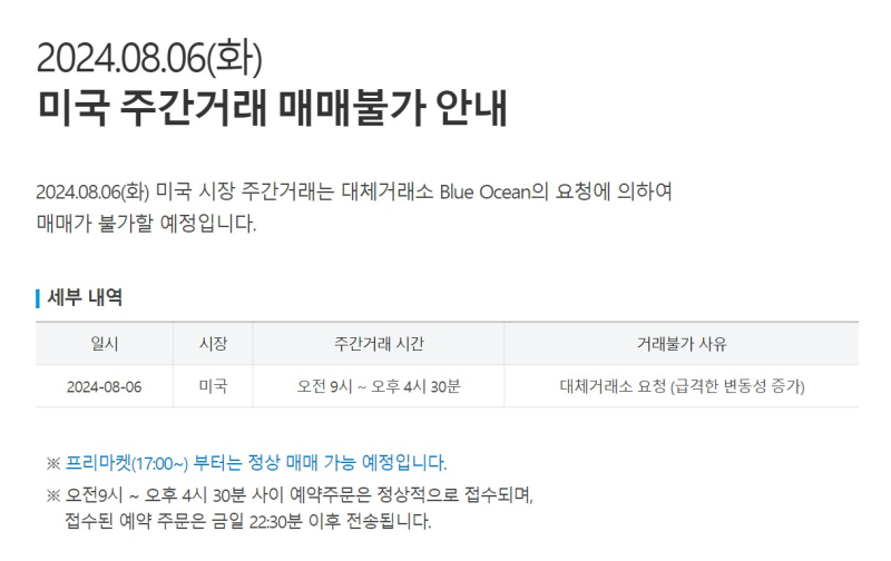 7일 금융투자업계에 따르면 전날 삼성증권, NH투자증권, KB증권 등 미국 주식 주간거래 서비스를 제공하는 증권사들이 해당 서비스를 중단한다고 공지했다. 이는 미국 현지 대체거래소(ATS)인 블루오션(Blue Ocean)에서 시스템 장애가 발생한 영향이다.