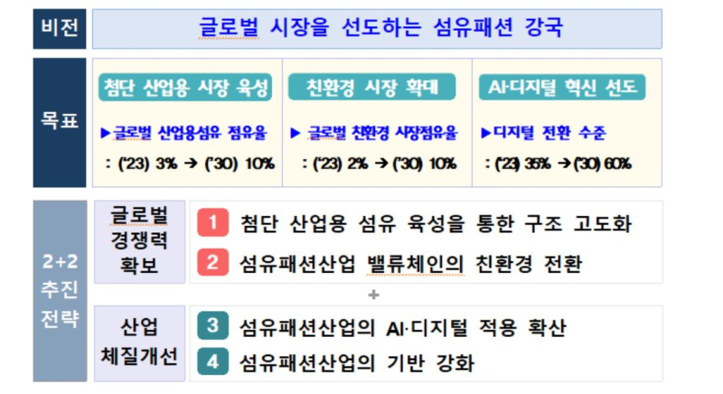 이에 정부는 섬유·패션산업의 체질을 개선하고 글로벌 경쟁력을 강화하기 위해 업계와 전문가 의견을 수렴해 이번 전략을 마련했다.