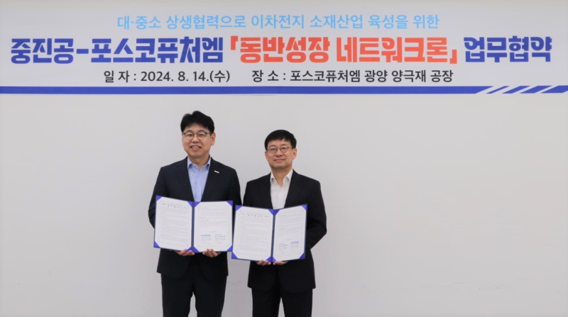 중소벤처기업진흥공단(이사장 강석진, 이하 중진공)과 포스코퓨처엠(대표이사 유병옥, 이하 포스코퓨처엠)은 14일 전남 광양시 소재 포스코퓨처엠 양극재 공장에서 '동반성장 네트워크론' 공동지원을 위한 업무협약을 체결했다.