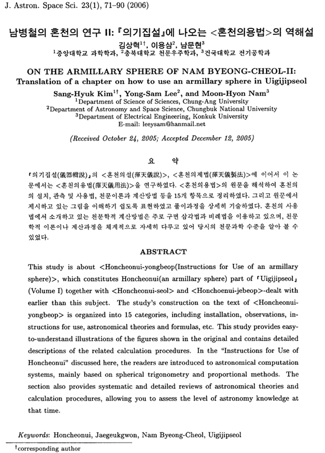 경희대팀은 산타크루즈대와 공동으로 그 동안의 연구 내용을 정리하면서 조선시대 학자 남병철에 대해 한국우주과학회가 발간하는 학회지 논문에 게재된 내용을 참고문헌으로 제출했다.